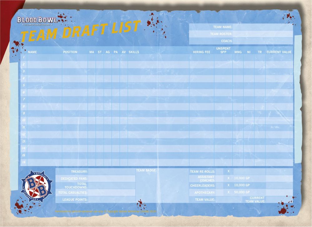Players are the only compulsory element on any Blood Bowl team. Each team roster details all of the players available to a team of that type and their Hiring Fee. When drafting a team, you should select the players you want to permanently hire for your team, pay their hiring cost from your Team Draft Budget and make a record of the player on the Team Draft list.