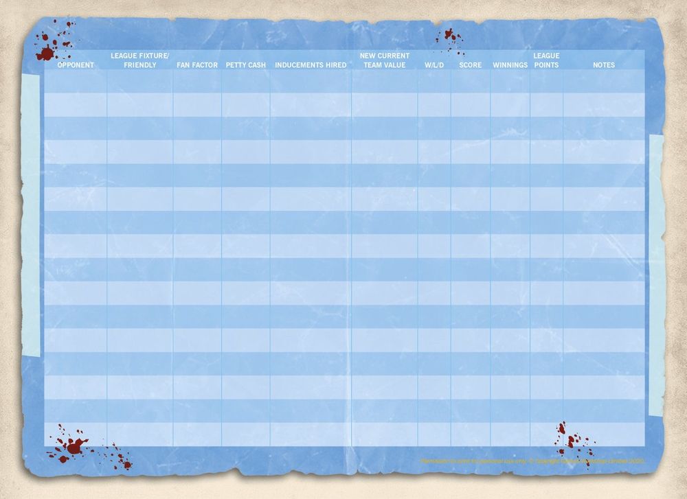 There is also space to list other important team details, such as the Sideline Staff permanently hired, the number of team re-rolls bought and how many Dedicated Fans follow the team, as well as the team type, name and the name of the coach.