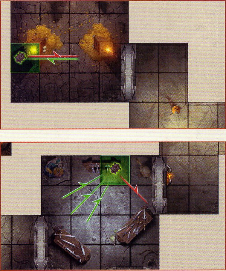 Range is measured by placing the circle at the end of the range ruler over the centre of the square occupied by the player performing the action. The other end of the range ruler is positioned so that the ruler covers the target square, with the line along the centre of the range ruler passing through the centre of the target square. The target square will fall into one of the four bands marked on the range ruler: