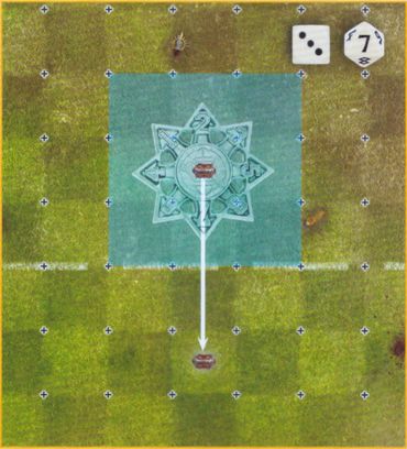 Here the ball is Deviating and a D6 and a D8 are rolled. The ball will then move 3 squares (as determined by the D6) in direction 7 (as determined by the D8).