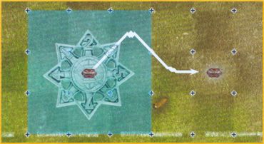 Here, the ball is required to Scatter (3) from its current location. The first D8 roll is a 3, the second D8 rolls an 8, and the third D8 rolls a 5 meaning the ball will Scatter as shown below before ending in the final square.