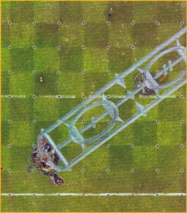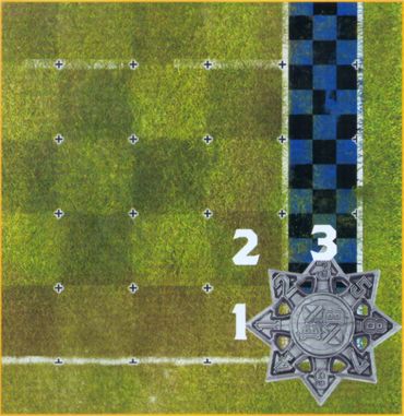 Should the ball leave the pitch from a corner square, position the Random Direction Template as shown in the diagram below and roll a D3 to determine the direction of the Throw-in.