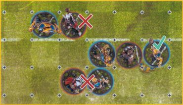 To measure the range, place the circle at the end of the Range Ruler over the centre of the square occupied by the player performing the Throw Team-mate Action. The other end of the Range Ruler is positioned so that it covers the target square with the line running through the centre of the Range Ruler passing directly through the centre of the target square.