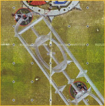 Setting up a game of Blood Bowl is easy. Simply place the pitch on the playing surface in between the two Coaches and give each Coach a dugout in which to place any markers they may need during the game. Then, place the Random Direction Template in a place that both Coaches can easily see and that corresponds to the grid on the pitch: this will not be moved during the course of the game.